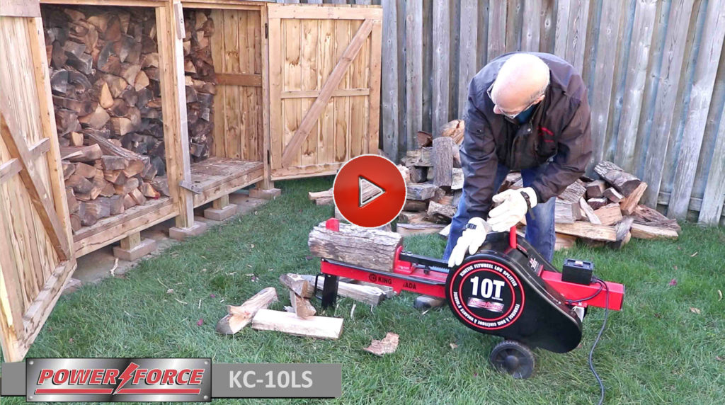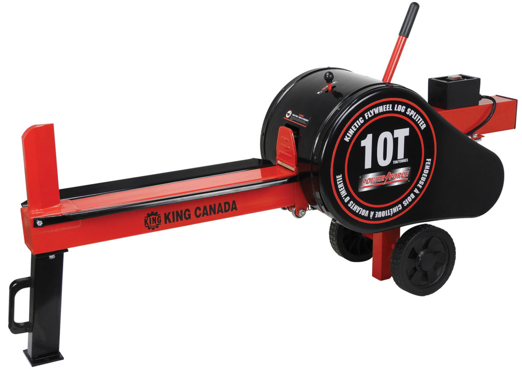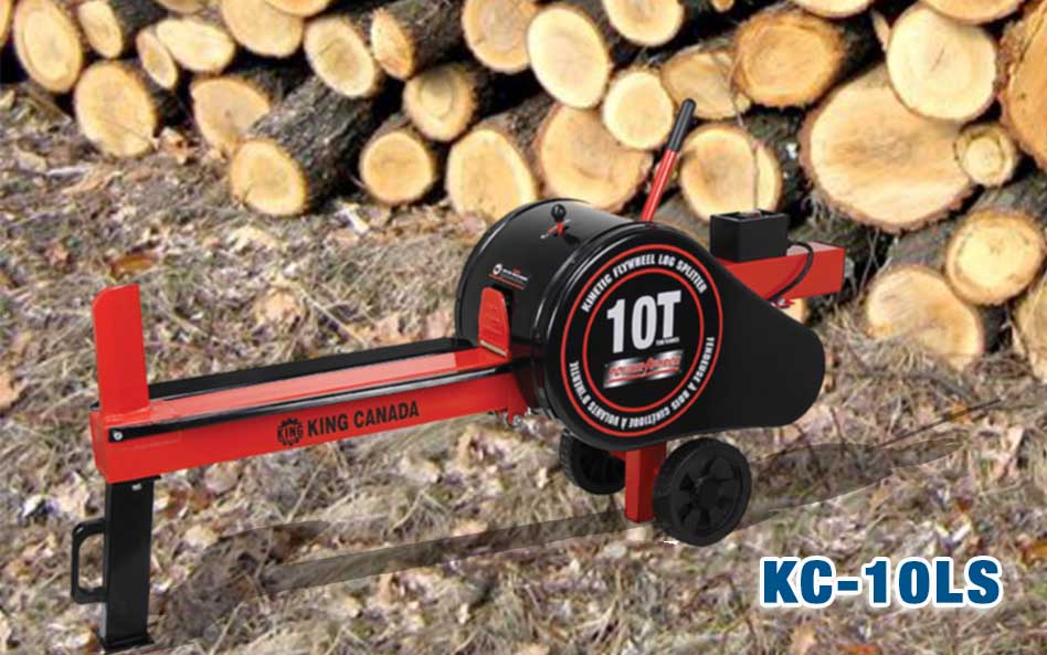 The new Power Force Log Splitter (model KC-10LS) outsplits any 10 ton log splitter on the market. Twin flywheels store energy form the 2 HP 120V electric motor, while hardened steel pinion gear transfer energy from the flywheels, enabling the KC-10LS to split logs up to 21″ long with a diameter up to 12″. And, it features an impressive 1 second cycle time.
