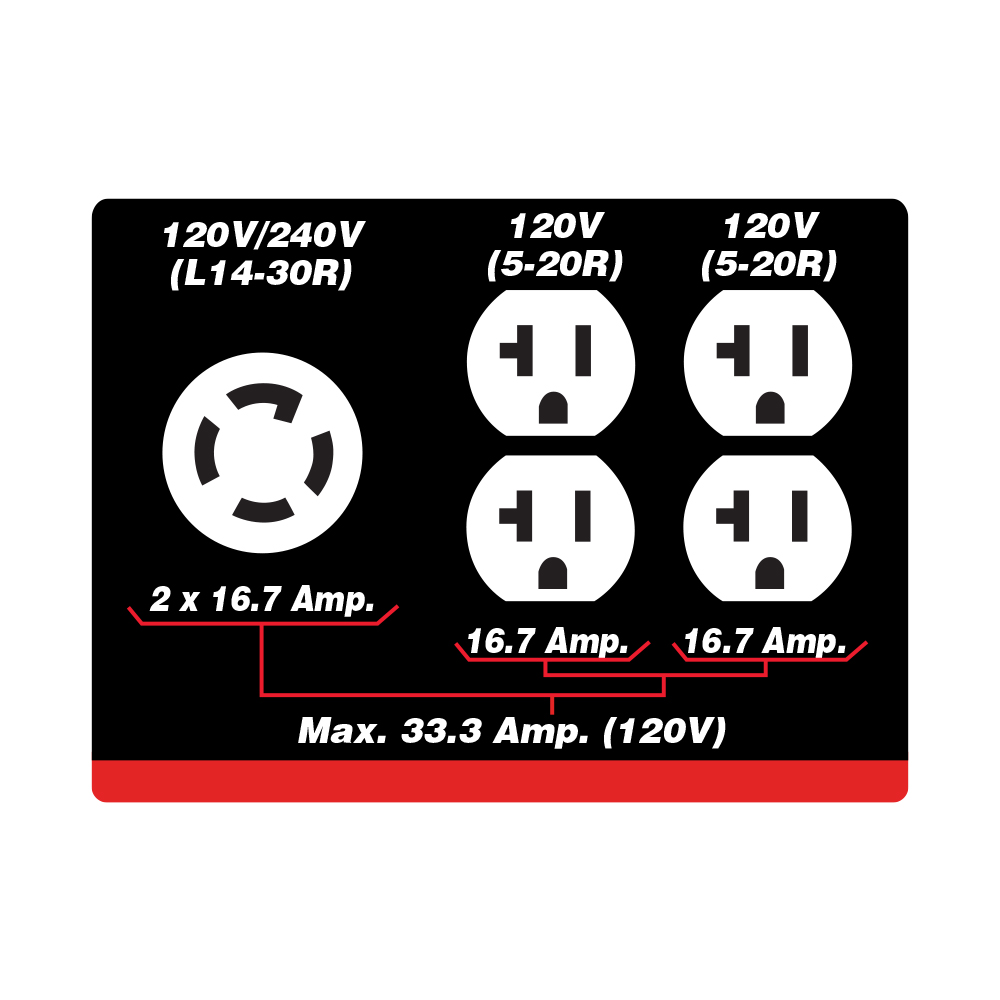 - AC current (120V / 240V) Gasoline / Propane33.3 Amp./16.7 Amp. / 27 Amp./13.5 Amp.